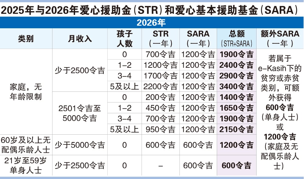 (八打灵再也12日讯)2026年财政预算案给予家庭的爱心援助金(STR)及爱心基本援助金(SARA)总额与今年持平,但STR现金援助的一部分将改以SARA形式发放。